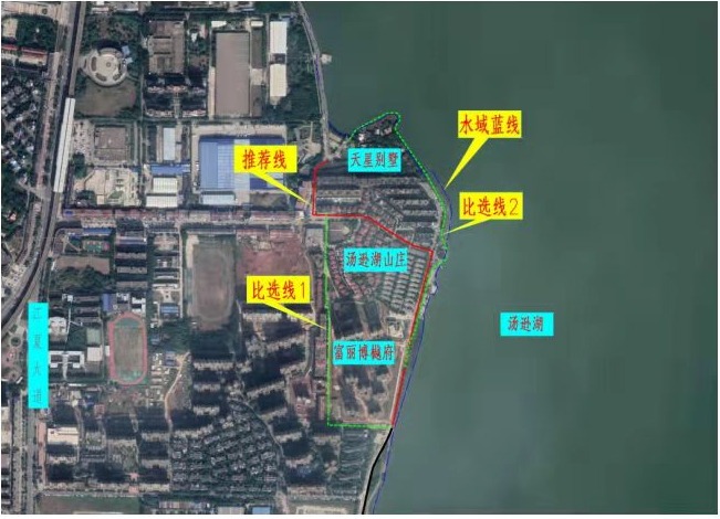 图中红线为汤逊湖环湖绿道未连通的部分。