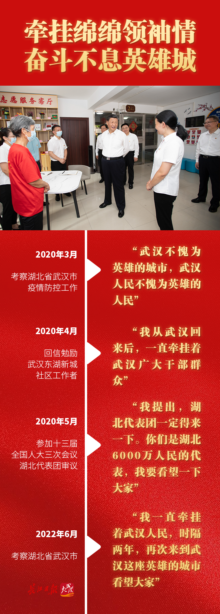英雄城市的一点一滴,始终牵挂着人民领袖的心。两年前,3月10日,习近平总书记来到武汉抗疫一线,深情称赞“武汉是英雄的城市,湖北人民、武汉人民是英雄的人民,历史上从来没有被艰难险阻压垮过”。一个月后,武汉正式解除离汉离鄂通道管控措施那天,总书记给东湖新城社区全体社区工作者回信:“我从武汉回来后,一直牵挂着武汉广大干部群众。”