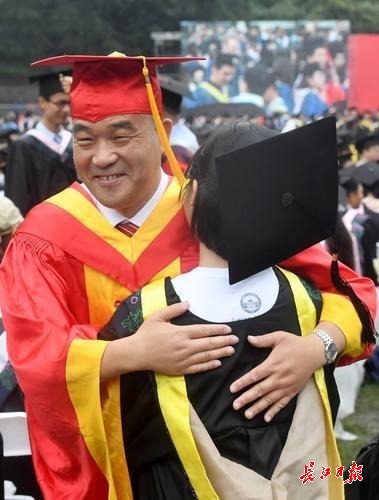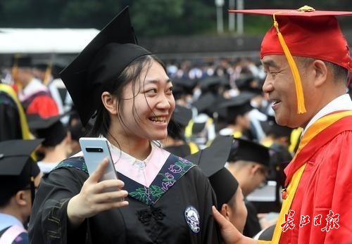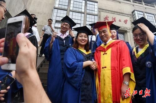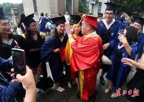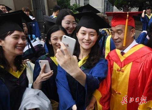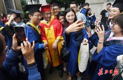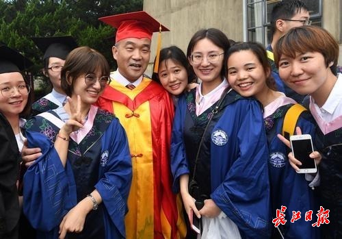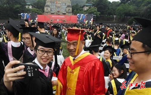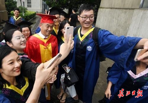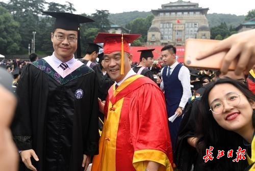 图为在毕业典礼上,武大校长窦贤康成为毕业生们追捧的“明星”,一批又一批的毕业生围住他“求合影”。