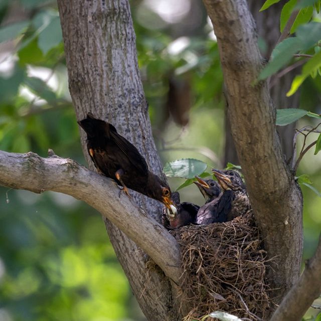 6月24日7点到9点之间,他看到,两只成年鸟鸫不辞辛劳地从远处叼来活蚯蚓后,并不直接飞回窝中。它们会站在附近大树树顶,警惕地打量一下四周,在确定没有其它鸟类跟踪它们后,才悄悄地回到窝中,把蚯蚓喂给嗷嗷待哺的幼鸟们吃。