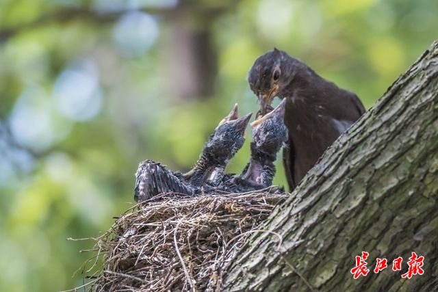 李维斌告诉长江日报记者,在汉口江滩三阳广场上,有一个小森林。这个小森林中的一棵大树上有一个乌鸫窝,两只成年乌鸫正在抚育四只幼鸟。