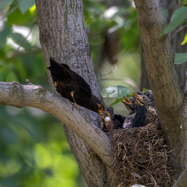 李维斌说,在这期间,他意外瞧见了这两只成年乌鸫吃掉幼鸟粪便的场面。幼鸟拉出的粪便像白色的鸽子蛋,被两只成年乌鸫一口一个吞进了肚中。