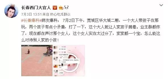 7月3日下午,知名博主@长春西门大官人在微博上发布了一条消息:网友爆料7月2日下午,宽城区一小区,一位妈妈带着孩子在小区里玩耍,期间,因为和另外一个孩子闹起了小矛盾,动手打了一下,这位妈妈就让别人家的孩子跪在小区广场里。