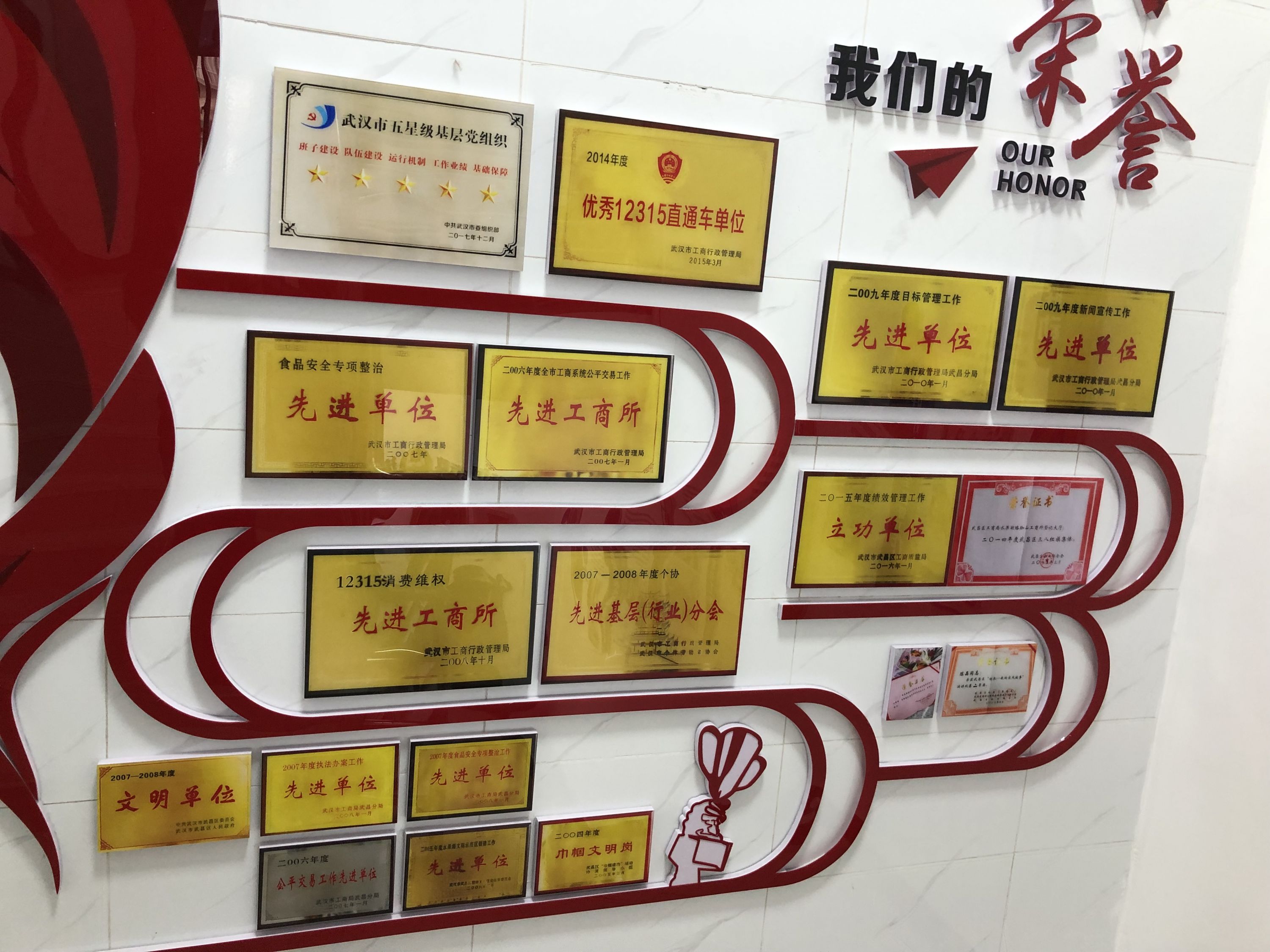 而二楼墙面上,“武汉市五星级基层党组织”等各种荣誉牌匾,悄悄诉说着“全国市场监管卫士”的一步步坚实脚印……
