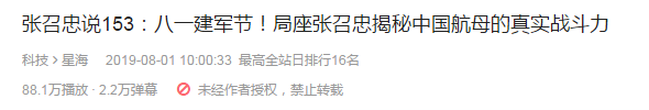 这档特别节目备受网友关注,第一期《八一建军节!局座张召忠揭秘中国航母的真实战斗力》于8月1日上线,主要内容为辽宁舰,B站播放量接近90万,最高全站日排行16名!