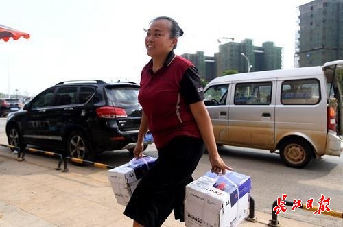 下午4点05分,汤明兰的面包车来到了当天第三个驿站恒大龙城2期,她把装在快递口袋中的包裹搬运完后,开始搬运两个大件——长宽均超过一米。“应该是家具,还好不算特别重”,她麻利地把包裹抱下车,小碎步快速进入了站点。“你别试了,搬不动的!”见她搬得快,长江日报记者想上去试试包裹究竟有多重,驿站里的工作人员说,这包裹起码有50公斤,一般女性很难抱着“跑”。