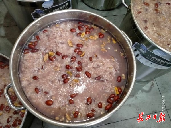 为居民熬制腊八粥是袁家社区每年一度的迎春传统。上一任社区书记孙建云作为发起人,从2008年开始一熬就是15个年头。退休后,她找到接任书记的“90后”小伙冯杰,联合江岸区益汇天下养老服务中心,提前一周采买了糯米、红豆、薏米、莲子、红枣、桂圆、花生等15种食材,利用双休清洗、浸泡,先将红豆、莲子等配料一一煮透。腊八节当天凌晨1时许开始,社区群干和益汇天下的志愿者陆续将150斤糯米下锅,与配料一起混合熬制。