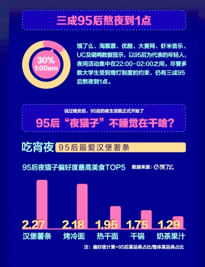 “没有什么是一顿宵夜解决不了的。如果有,那就两顿。”饿了么数据显示,95后年轻人最爱的宵夜品类是汉堡薯条、烤冷面、热干面等。特别值得一提的是,养生党避之不及的“高热量”似乎并没有影响95后夜猫子的宵夜选择,武汉的热干面成为全国95后最爱宵夜的第三位。