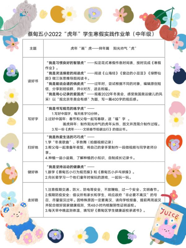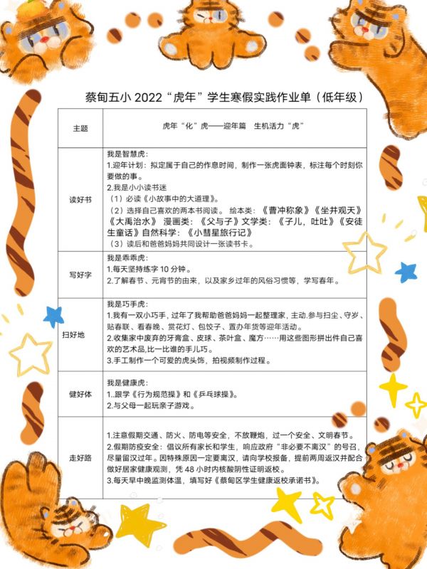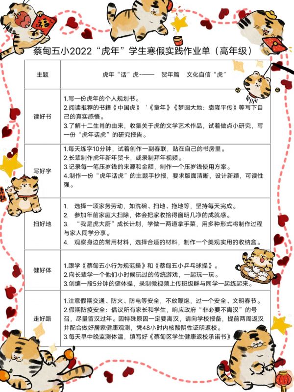 蔡甸五小的“虎年”寒假实践作业单中书面作业并不多,主要将中华传统的年文化与学校“五好教育”(读好书,写好字,扫好地,健好体,走好路)相结合,体现年龄段特点,让学生在“玩”中学,在“做”中学。所有学生每天坚持练字10分钟,跟学《行为规范操》和《乒乓球操》,还有各类动手、实践、劳动作业。