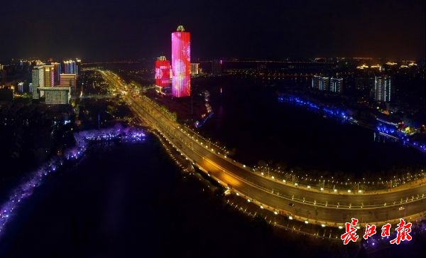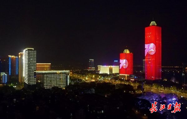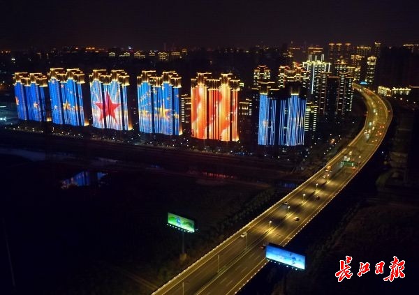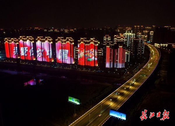 长江日报-长江网10月5日讯 10月4日晚,湖北武汉,机场二通道姑李路段高架桥沿线的楼宇立面上,“祖国万岁”“我爱你中国”“不忘初心牢记使命”等字样以及国旗、五星红旗等画面循环播放,霓虹璀璨、光影流动,给从机场二通道进入武汉市区的宾客带来强烈的“第一眼”视觉冲击。