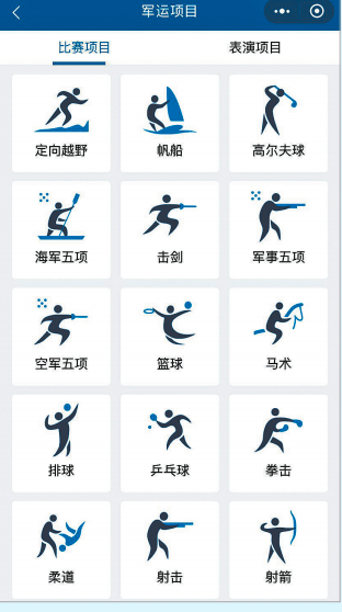 本届军运会有25个比赛项目和2个表演项目,其中空军五项、军事五项、海军五项等充满“军事血统”的比赛项目最具特色,这些项目一般早期都用于军事训练。想要了解比赛内容、赛制,或者本届军运会中该项比赛的时间地点,点击对应项目图标,即可获取详细信息。