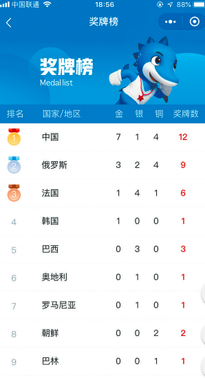 每届奥运会期间,每日的奖牌榜更新总是最牵动人心,军运会也不例外。点击“奖牌”,100多个国家向你奉上最新“战果”。和奥运会奖牌榜一样,除了总的奖牌数外,还有具体的金、银、铜牌数目,哪些国家之间竞争激烈,一目了然。