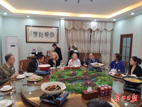 长江日报-长江网10月27日讯(记者姚旭)25日,到东湖高新区龙泉山风景区参观的西班牙国防部教育训练部部长 Valcarce Garcia中将、军运会西班牙代表团团长Pedro JoséCifo少将等4位外宾被龙泉街覃庙村村民余帆热情邀请到她的农家小院,共进晚餐。