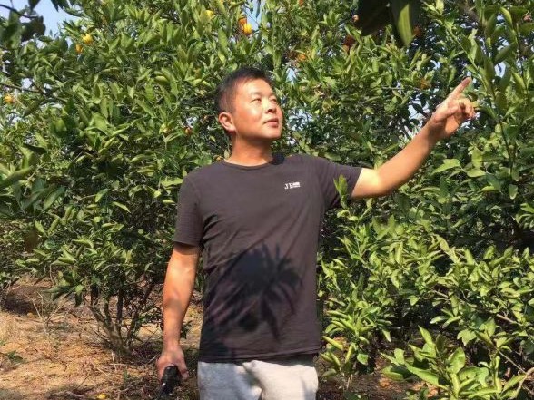 徐斌在生态农业园内查看橘子树长势。记者胡毅 摄