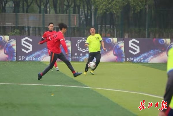本次赛事的揭幕战由江岸区岱家山知识产权科创小镇、江岸区教育局亲们足球队、大智街道同心队 、四唯街道华夏五千四支代表队两两捉对厮杀。虽然都是来自各街道、机关单位的业余选手,但他们在场上踢得有板有眼,一点也不业余。场上不时出现一些高难度的足球技巧和战术配合,引来亲友团的阵阵喝彩。最终,岱家山知识产权科创小镇队以5:0击败江岸亲们队,大智街同心队则以2:1力克四唯街华夏五千队。