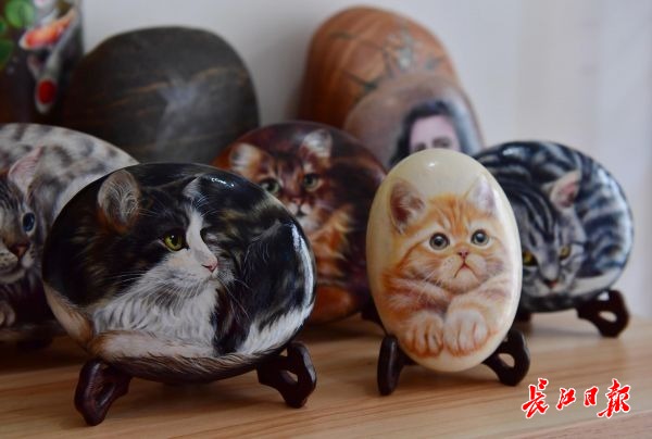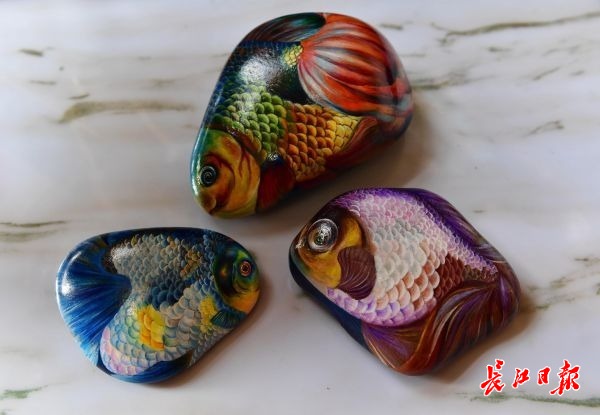 据了解,武汉市像程玲这样的石画爱好者有50多人,他们以从江河滩上捡拾来的石头为画布,根据石头的外形、纹理、色泽、质感等构思题材,自然景观、花鸟鱼兽无一不可,再以“超写实”的画法作画,一块普通的石头就变成了令人赞叹的艺术品。除了圈内交流,石画体验课也受到很多孩子和家长的喜爱。
