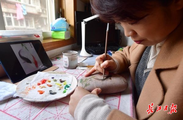 长江日报-长江网12月3日讯(记者金文兵)12月2日,武昌区武车宿舍一间“蜗居”里,38岁的程玲在一块石头上信笔作画,一条细腻、充满光泽与质感的鱼跃然而出。