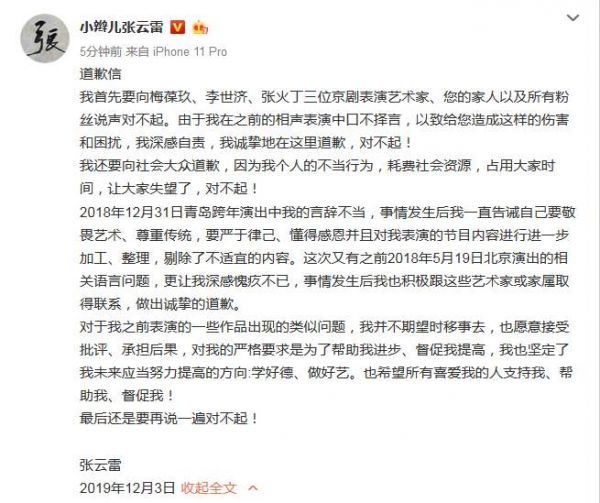 张云雷道歉了