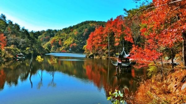 近日,湖南长沙岳麓山枫叶逐渐转红,吸引许多游客前来游玩赏景。