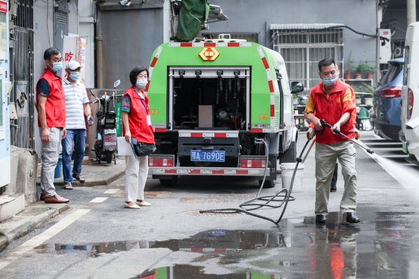 洪湖小区“自治合伙人”清洗路面。 通讯员张韦 摄