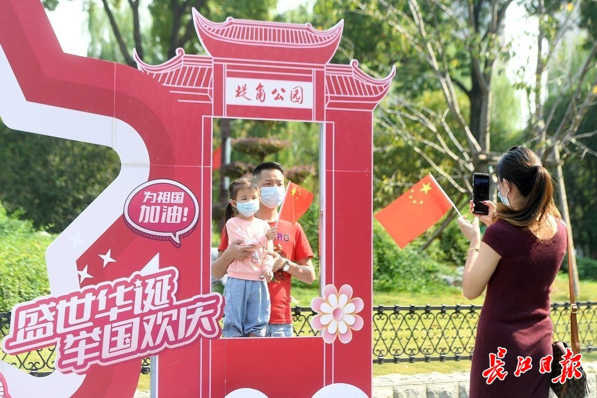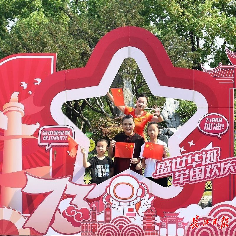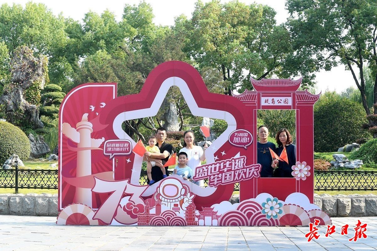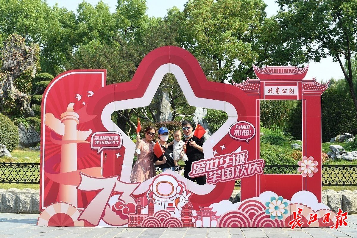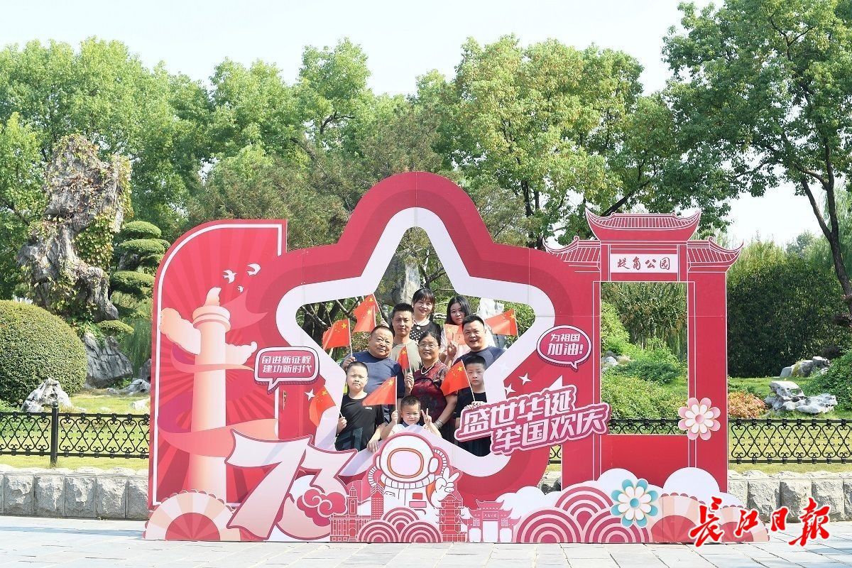 长江日报记者在公园看到,不少市民游客踊跃参与,在打卡墙前有的是一家三代人首次同框,有的是好久不见的兄弟姐妹团聚,合影里洋溢着笑脸……