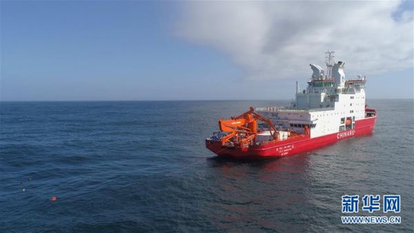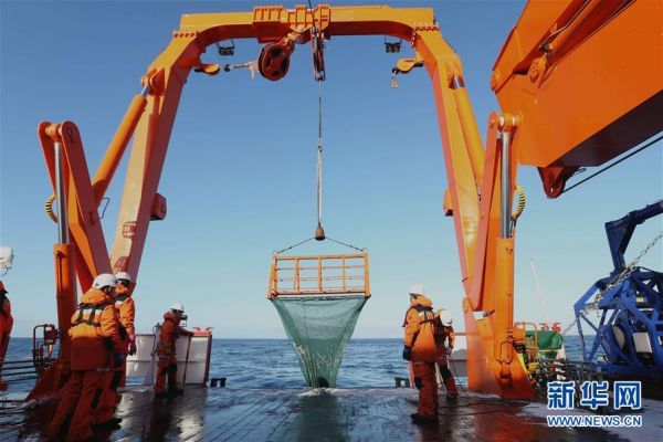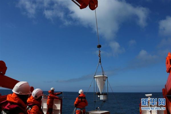 1月5日,科考队员在布放时间序列沉积物捕获器潜标。