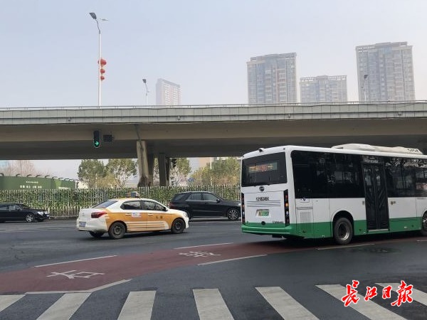 中北路与秦园东路路口,公交车压越“右转危险区”行驶。记者汪洋 摄