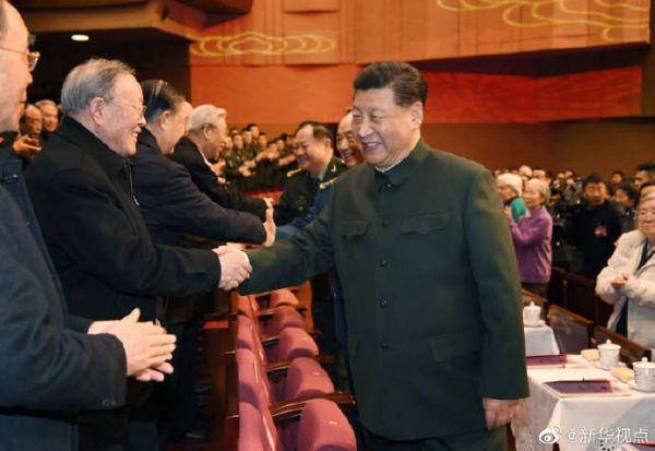 下午4时许,习近平来到老同志中间,全场响起热烈掌声。习近平同大家亲切握手,关切询问他们的身体和生活情况,共同回顾过去一年党、国家、军队事业取得的重大成就。老同志们一致表示,要更加紧密地团结在以习近平同志为核心的党中央周围,以习近平新时代中国特色社会主义思想为指导,贯彻习近平强军思想,贯彻新时代军事战略方针,坚持政治建军、改革强军、科技强军、人才强军、依法治军,不忘初心、牢记使命,锐意进取、开拓创新,为实现国防和军队建设2020年目标任务,为夺取全面建成小康社会伟大胜利作出新的贡献。