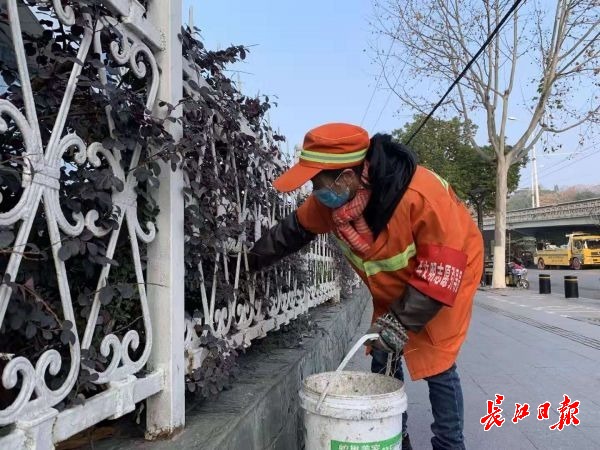 1月28日,武昌大桥清洁队环卫工人周命正在捡花坛中的垃圾 记者陶常宁 摄