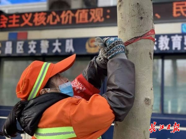 1月28日,武昌大桥清洁队环卫工人周命正在解下系在树上的一根废旧带子 记者陶常宁 摄