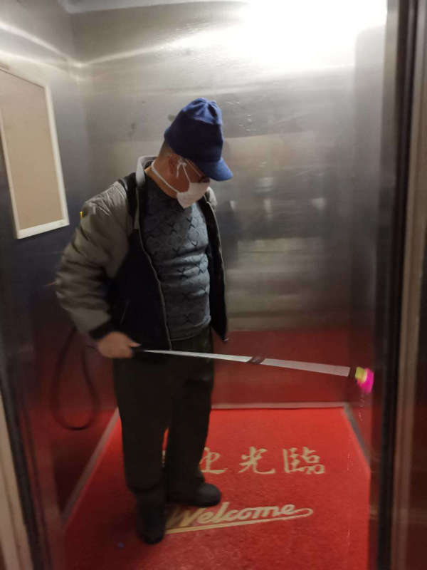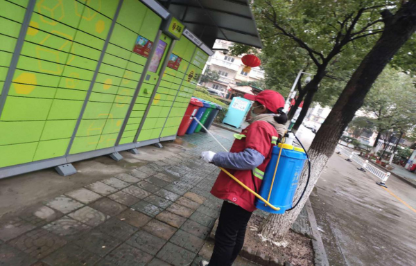 物业保洁员对辖区楼栋、公共区域进行全面消毒。