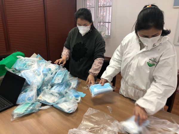 妇联志愿者在消毒情况下积极为居民分装口罩