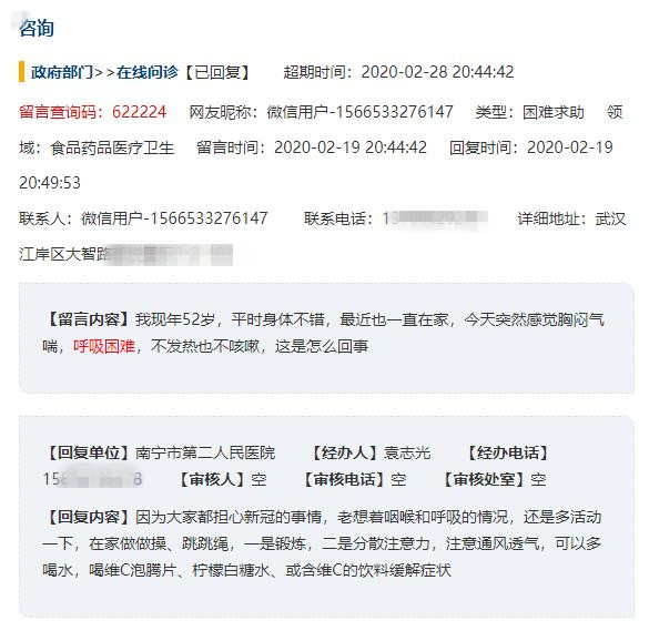 长江日报-长江网2月20日讯 “我平时身体不错,最近在家突然感觉胸闷气喘,呼吸困难,但不发热不咳嗽,是怎么回事呢?”19日20时44分,江岸区大智路一位52岁的市民在武汉市网群部长江网武汉城市留言板的在线问诊版块提问。