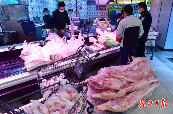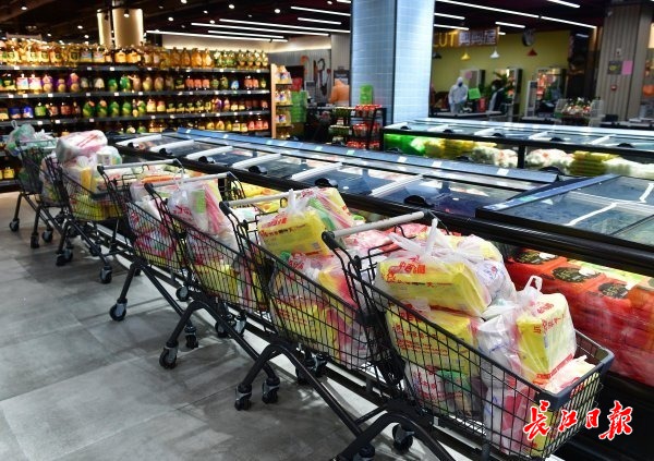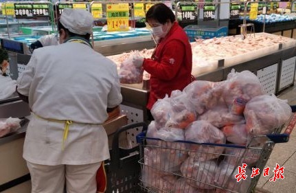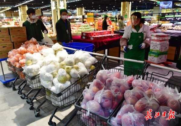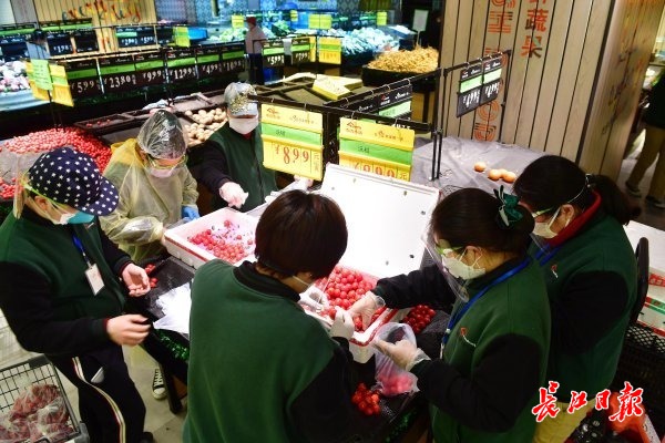 长江日报-长江网2月20日讯 2月20日,金银湖环湖中路中百仓储庭瑞店内,超市员工们纷纷忙着将各类商品打包,蔬菜、熟食、水果、速冻食品、猪肉等多个团购套餐,品种多,居民购买量也大。据了解,该超市员工只要能到店里来的都赶来上班,忙着为社区居民团购的商品打包。(记者李永刚 摄影报道)