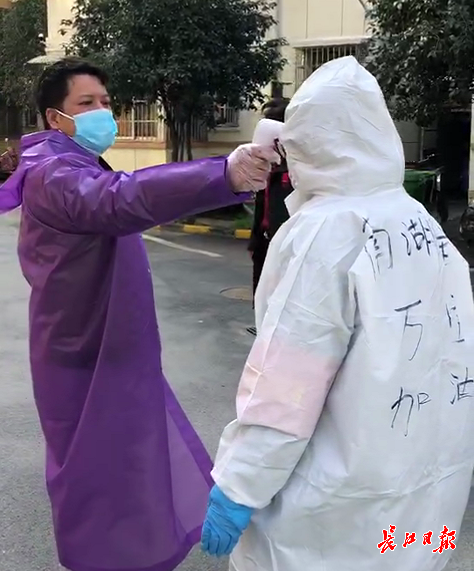 万莹(右)来到北港教师小区巡查,志愿者正在给她测温 陶可祎 摄
