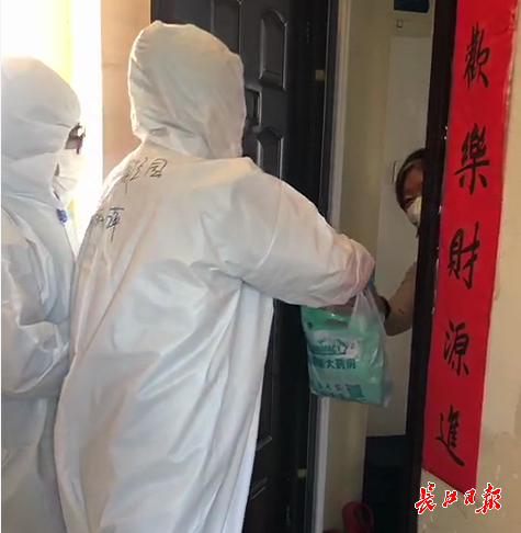 万莹(左一)和同事为居民上门送药 记者陶可祎 摄