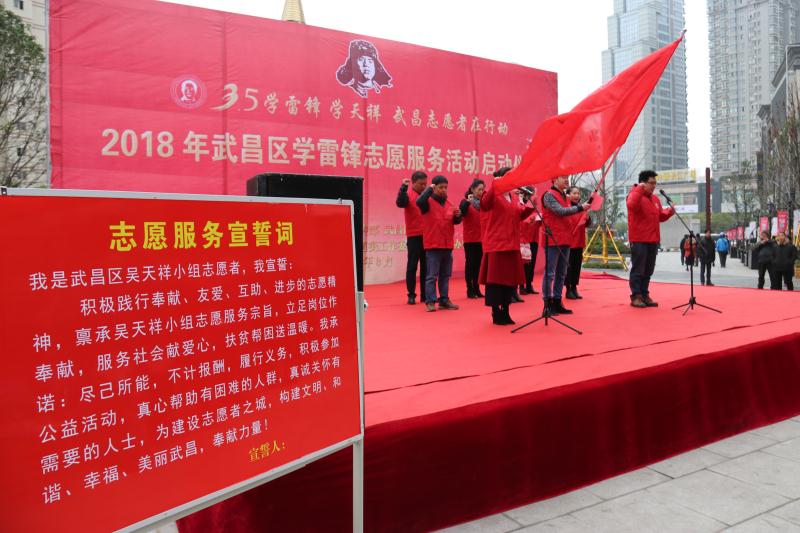 长江日报融媒体3月5日讯(通讯员余小菊 陶玉梅) “我宣誓,积极践行奉献、友爱、互助、进步的志愿精神,禀承吴天祥小组志愿服务宗旨……”今年3月5日是第55个学雷锋日,由中共武昌区委宣传部、区文明办主办,粮道街党工委、办事处承办的“学雷锋学天祥武昌志愿者在行动暨2018年武昌区学雷锋志愿服务活动”启动仪式在粮道街昙华林泛悦汇广场举行。