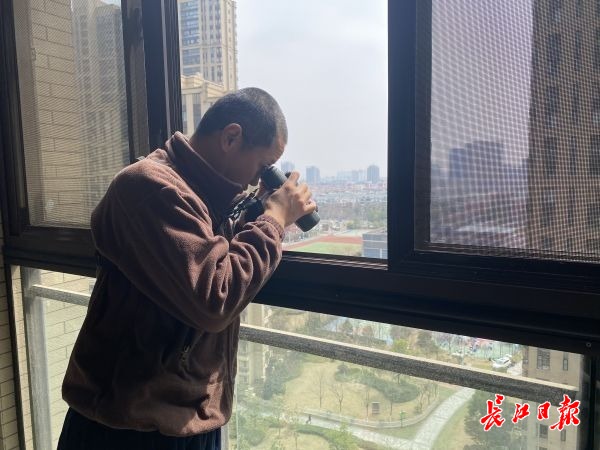 颜军在自家阳台上观鸟 记者陈奇雄 摄