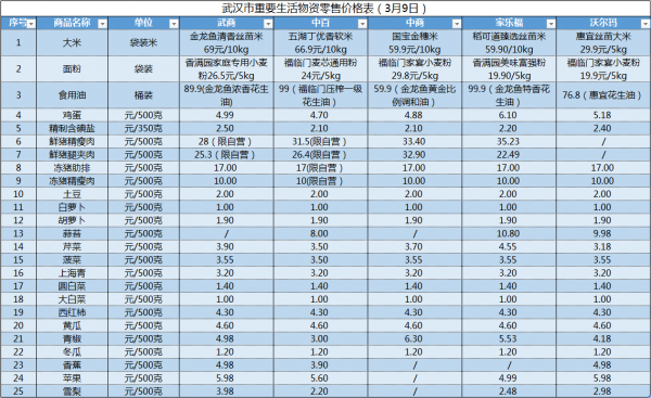 长江日报-长江网3月9日讯(记者张维纳)武汉市实行小区封闭管理以来,全市各大商超与社区对接,实行团购配送。自2月22日起,武商、中百、中商、家乐福、沃尔玛等五大超市将25种重要生活物资销售价格定期公布,让市民足不出户明明白白消费。