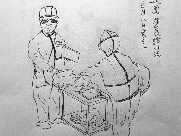 李宗祥住在雷神山医院A3病区,医护人员除了正常的治疗,还照顾他的一日三餐,给他送来新鲜的水果,陪他说话,让他有了战胜病魔的信心。“我感觉身体状况一天天变好,和大家朝夕相处的这些日子里,点点滴滴都让我感动。”李宗祥是一名美工,他决定用画将所见所闻记录下来。