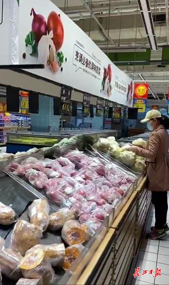 店内,各类商品有序摆放,蔬菜区、肉食区、熟食区、面点区、蛋糕区都摆放着满满当当的商品。记者看到,两位顾客在烤鸭摊位前正等着工作人员打包烤鸭。超市内所有的菜品和水果均已打包好且贴上了价签,比如,两个装在一起的长茄子共计376克,售价3.89元,大白菜秧3.38元/斤,一把620克售价4.19元;两个492克的大台农芒果售价12.64元。“顾客可以随取随走,不用称重,这样可以节约顾客的采购时间”,该店店长介绍,员工早上6时到岗,提前完成打包称重工作。