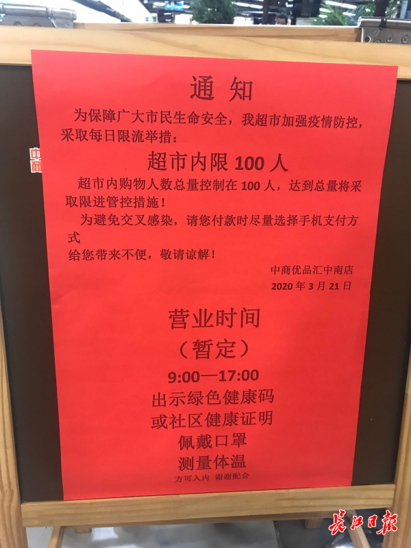 长江日报-长江网3月21日讯(记者张珺)今天,中商优品汇恢复正常营业,营业时间9:00-17:00,期间个人消费者可进店选购。为确保购物环境,超市内购物人数达到100人时将启动限流机制。