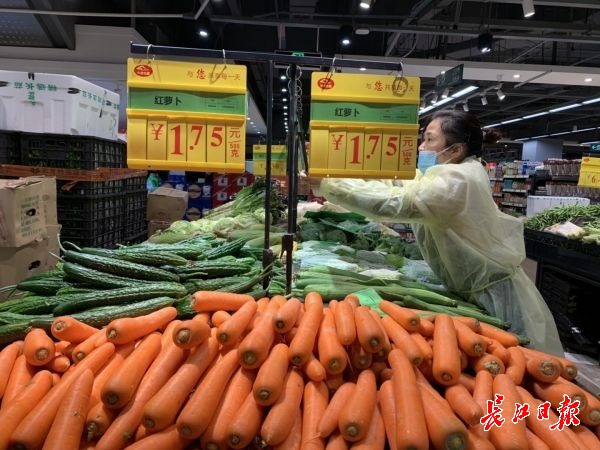 中商优品汇内,大批当季新品时令蔬菜——苋菜、蒜薹、红薯尖纷纷上架。记者现场看到,蔬菜水果的货架满满当当、品种丰富,前期暂停上货的鲜肉、活鱼、豆制品、鲜河粉、热干面等柜台全部重新打开。商品价格公示显示,商品价格为去年同期最低值。