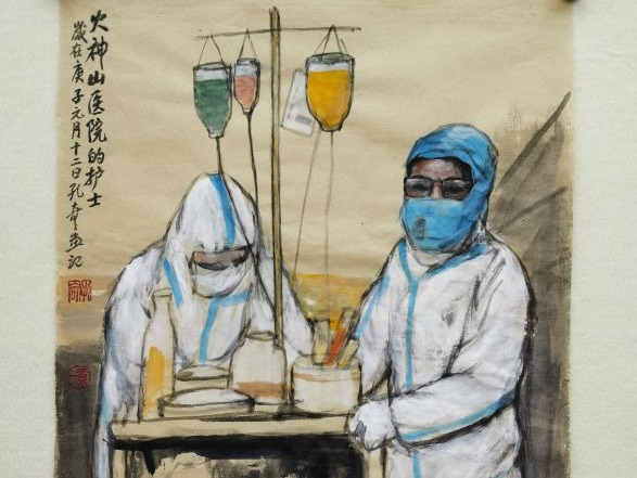 1944年出生的胡传满从小就喜欢画画。“我年纪大了又不能到一线,只能发挥一技之长,拿起笔墨去战斗,希望能够鼓舞大家的士气。”作为土生土长的武汉人,胡传满希望能够尽到自己的一份力。在宅家的这段时间里,他坦言:“除了吃饭就是在画画,经常画到凌晨一两点。”胡传满的灵感素材都来自电视或者手机上的抗疫新闻,有时候看到打动他的画面就会及时拍下来,再根据照片来进行二次创作。