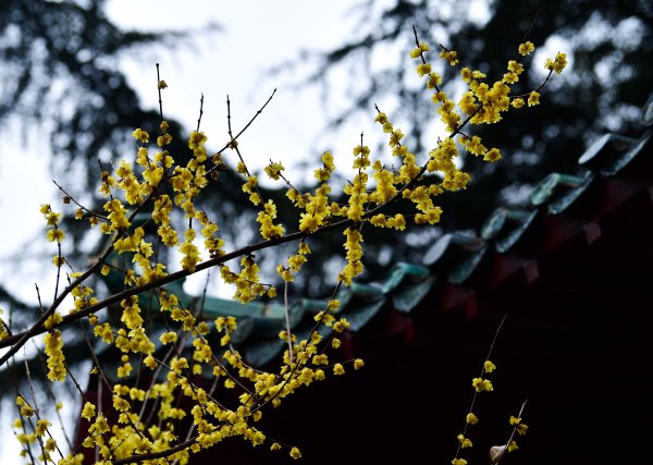 1月22日,武汉天气阴冷,小雨时断时续。解放公园和中山公园,金黄的蜡梅和粉的、白的梅花同时盛开,香味氤氲,让人赏心悦目、心生暖意。长江日报记者李永刚 摄