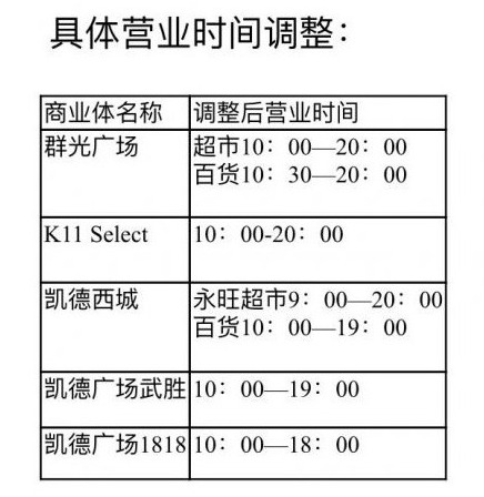 凯德集团相关负责人表示,在汉三家购物广场调整营业时间,具体为:凯德西城调整为购物中心上午10时至晚7时,负一楼永旺综合百货超市为上午9时至晚8时。凯德武胜广场为上午10时至晚7时。凯德1818为上午10时至晚6时。
