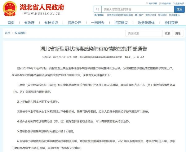 自2020年6月13日0时起,我省突发公共卫生事件应急响应级别由二级调整降低为三级。为统筹推进学校疫情防控和复学复课工作,经省新型冠状病毒感染肺炎疫情防控指挥部综合研判决定,现就有关安排通告如下: