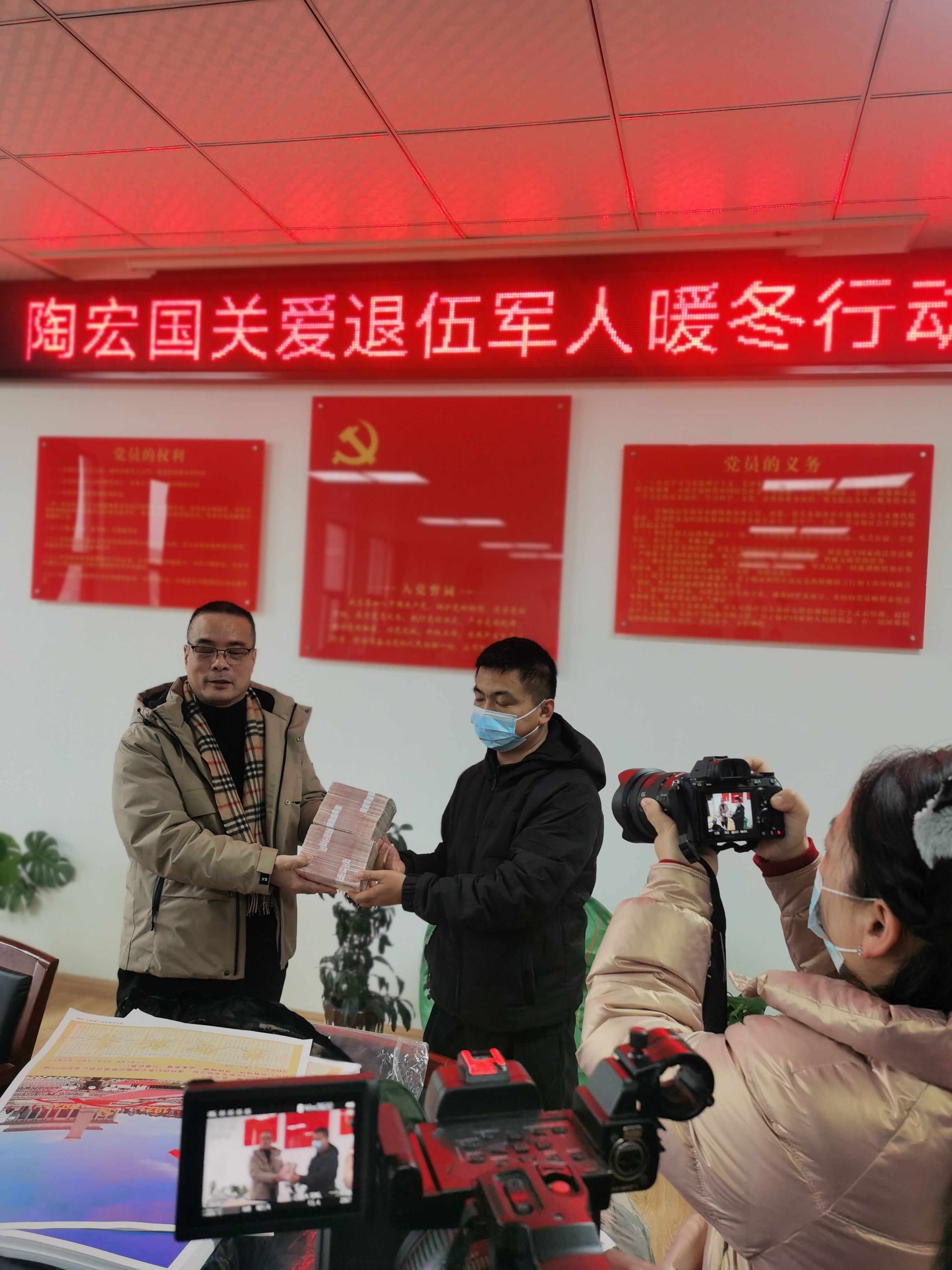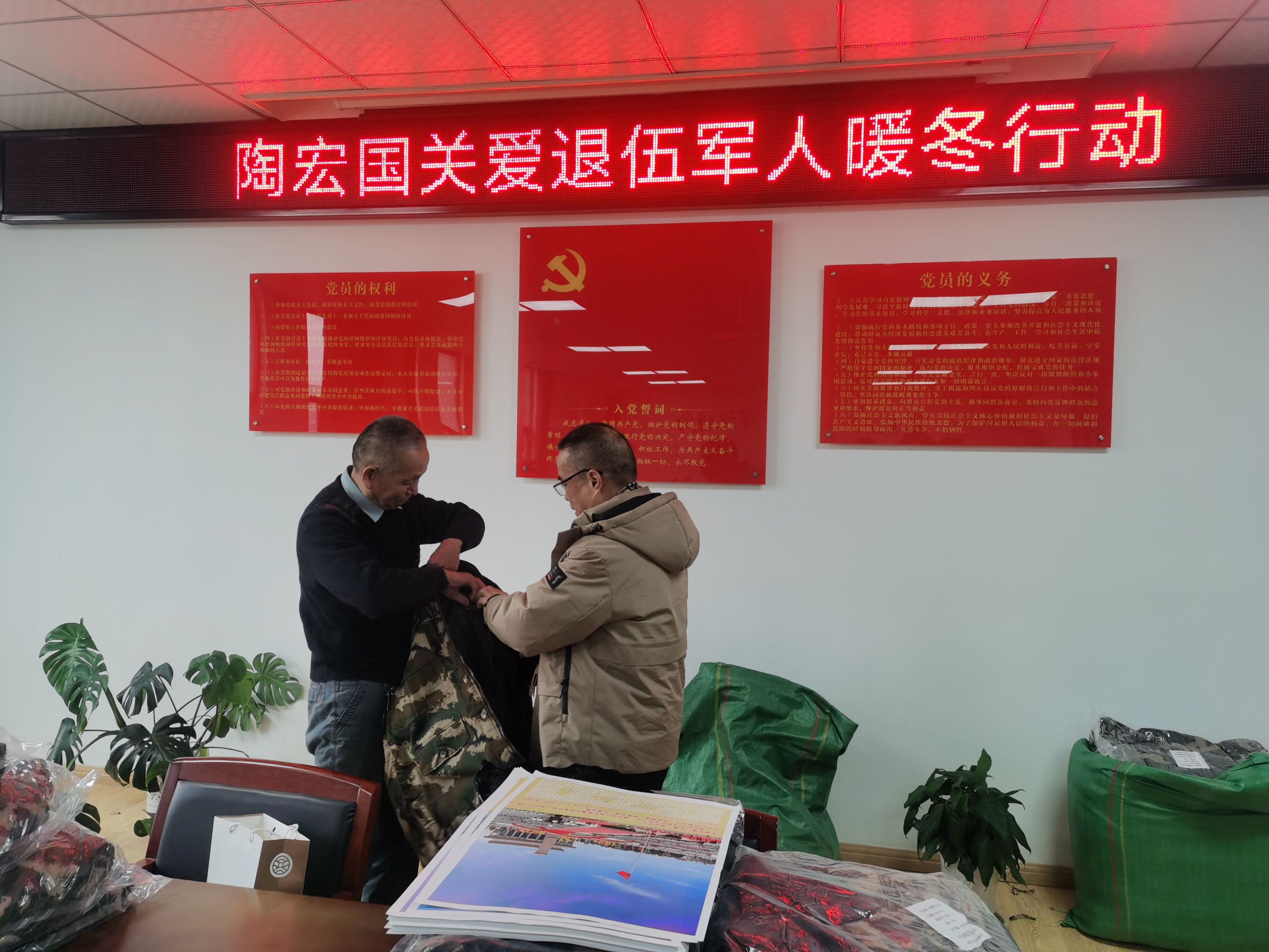 长江日报大武汉客户端1月25日讯(记者唐婧妮)25日上午,武汉好人、全国十佳“最美家乡人”陶宏国拿出5万元,为新洲阳逻潘庙村80名退役军人购置御寒大衣,同时携大米、年饭礼品包上门慰问军属。陶宏国现场捐资20万元用来专项帮扶退役军人。