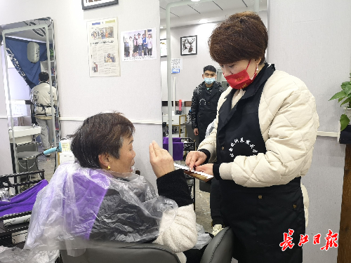 林喜平是当天的第一批客人,记者与她交谈时她头上已经包好了烫发的保鲜膜。林喜平家住徐东,当天是特地打车过来做头发的。听说是记者采访,她非常主动地介绍起来:“我是老顾客,一直在她店里理发,他们服务好,技术也好。小叶不简单,我经常拿他们的故事激励我儿子。”据了解,林喜平的妹妹也是聋哑人,“我多照顾一点生意,希望能给他们微薄的帮助。”
