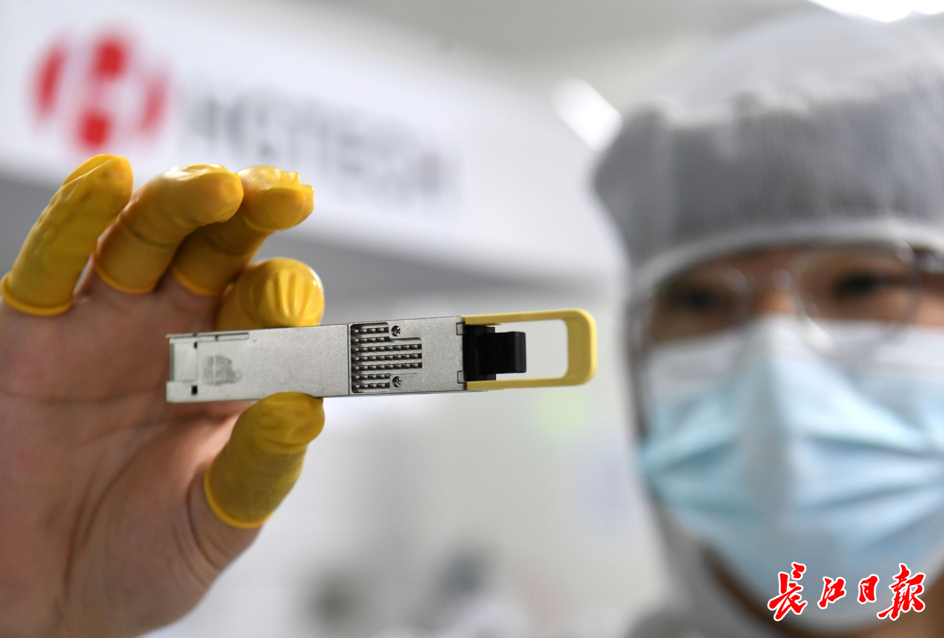 华工科技员工展示生产的400G光模块。 长江日报记者 高勇 摄